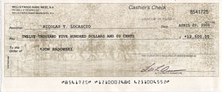 The cashier's check looks convincingly real to the uninformed, but it's far from it. Most REAL cashier's checks I've seen have a mechanical imprint of the check amount in addition to the printed amount.